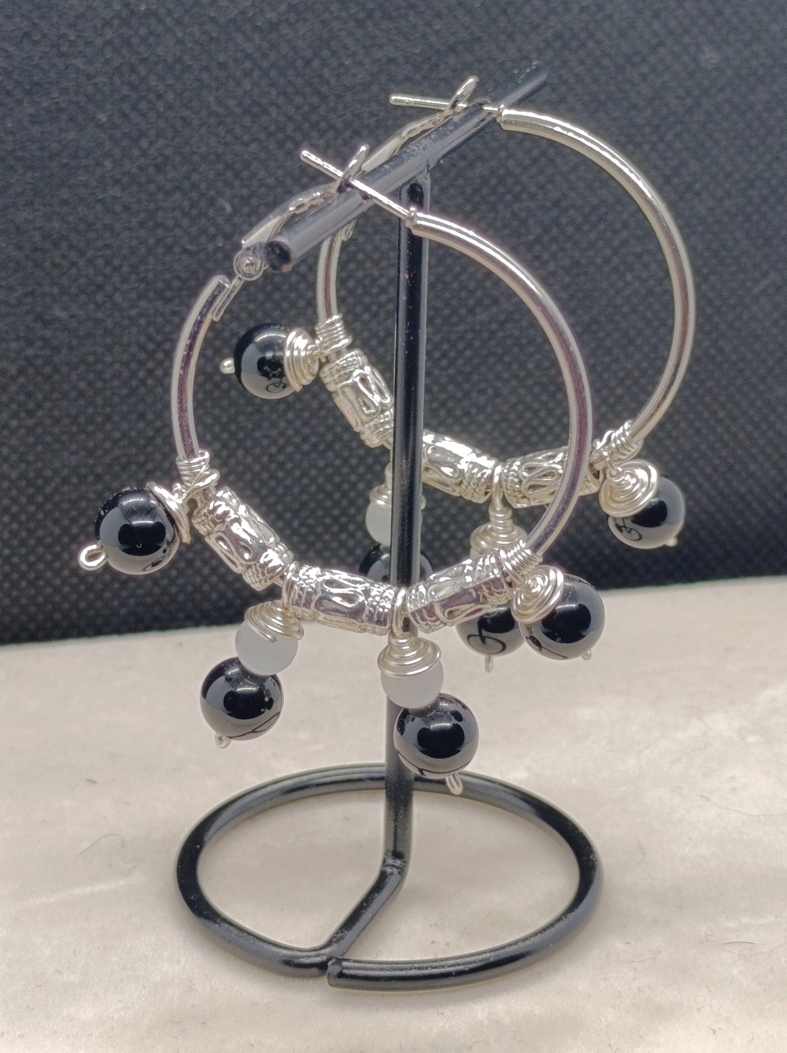 Aros Obsidiana hechos a mano con cuentas de obsidiana y ojo de gato. El aro es de acero inoxidable.