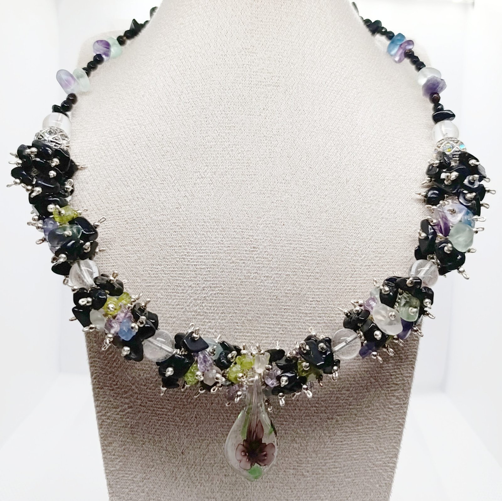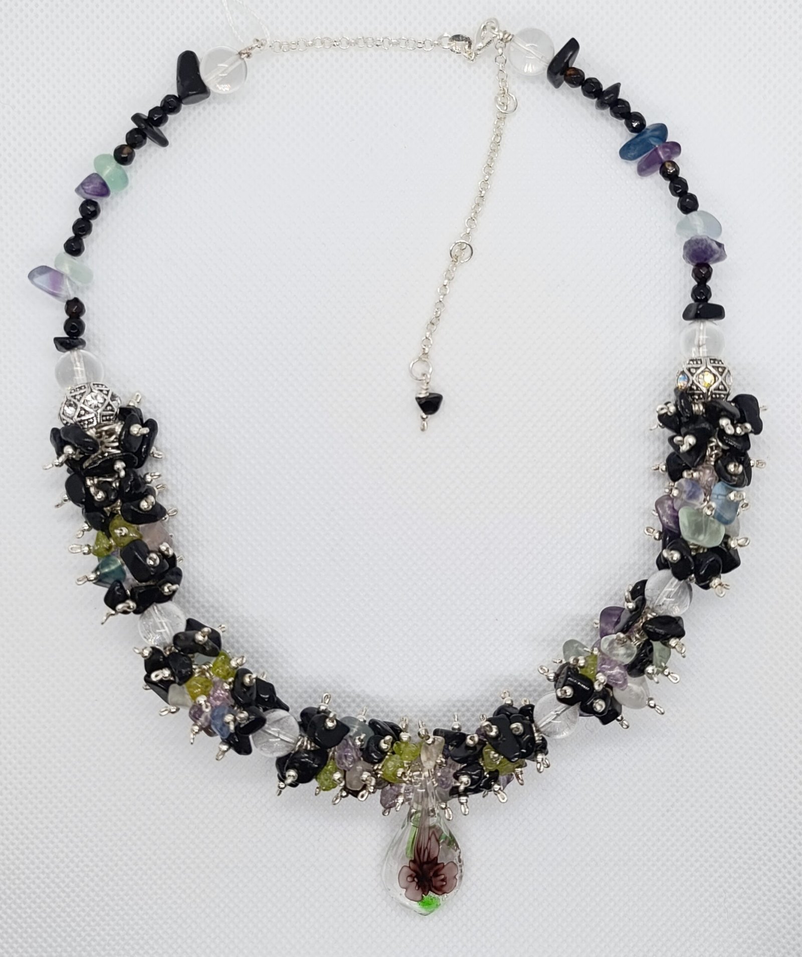 + Free ShippingCollar Fantasy Black hecho a mano con cuentas de turmalina negra, fluorita, peridoto, amatista, onix y cuarzo. Cadena de plata y cabujon de cristal de murano.