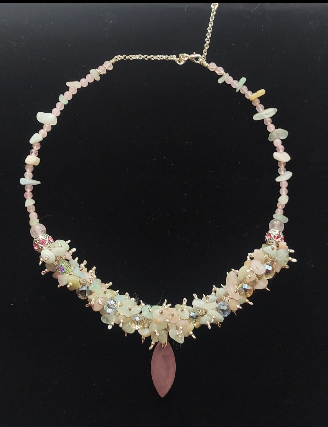 Collar Fantasy hecho a mano con chips de morganita, cabujón y cuentas de cuarzo rosa y cuentas de cristal facetado.