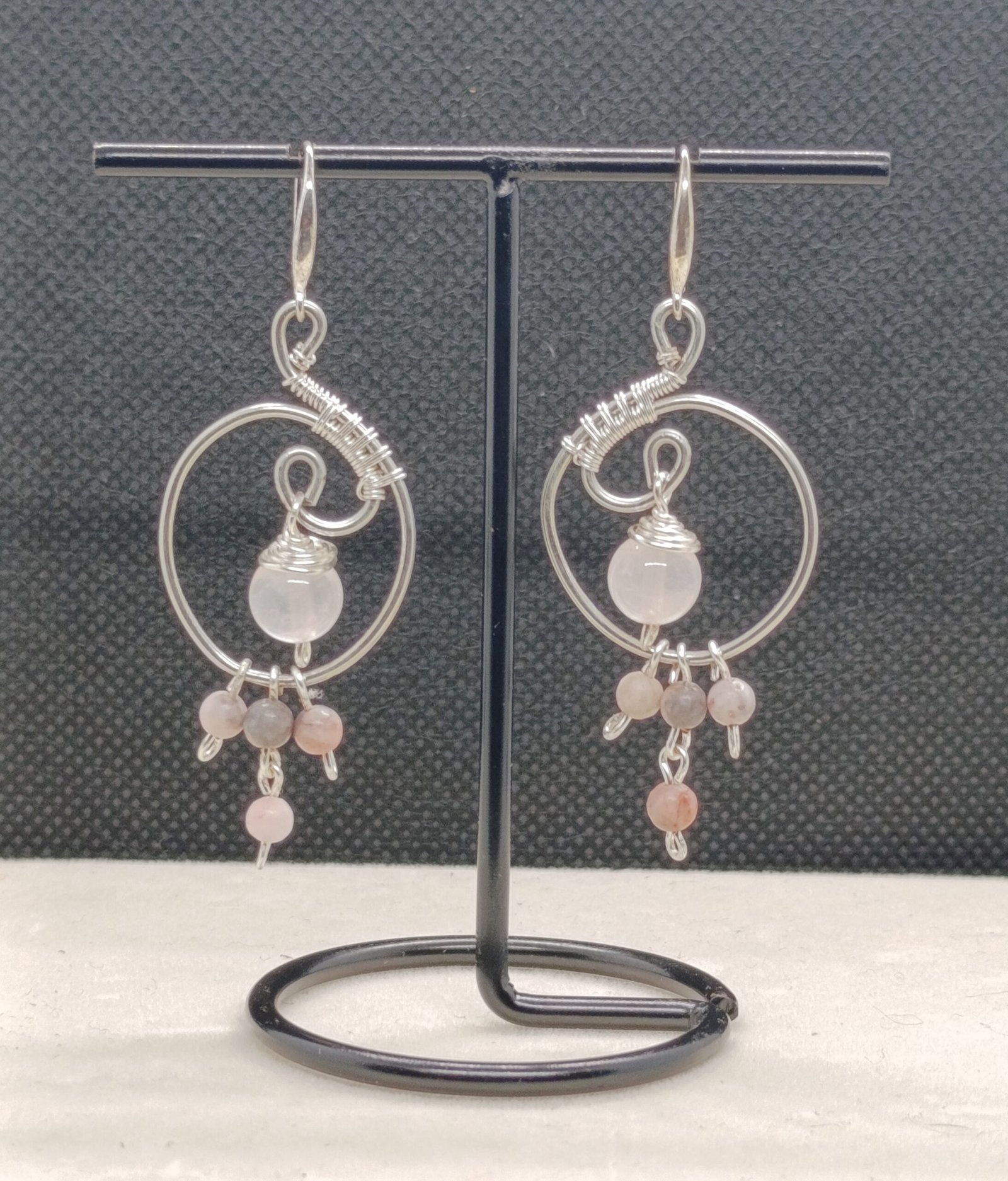Pendientes Cuarzo Rosa hechos a mano con cuentas de cuarzo rosa y jaspe cebra. Los enganches son de plata.