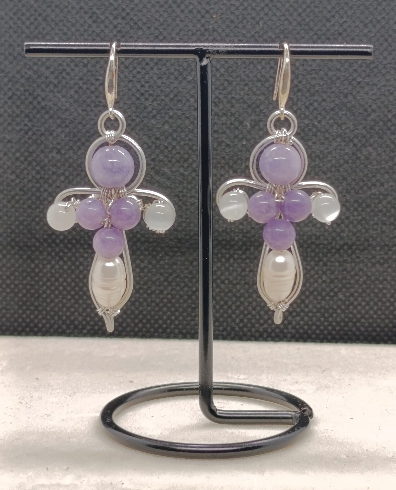 Pendientes Musa hechos a mano con cuentas de perlas de agua, angelita morada y ojo de gato, los enganches son de plata