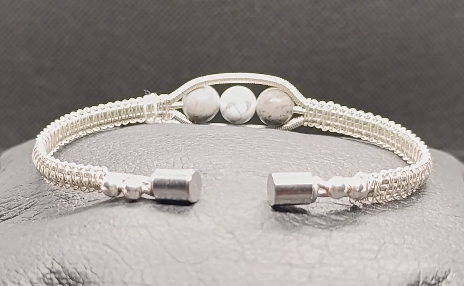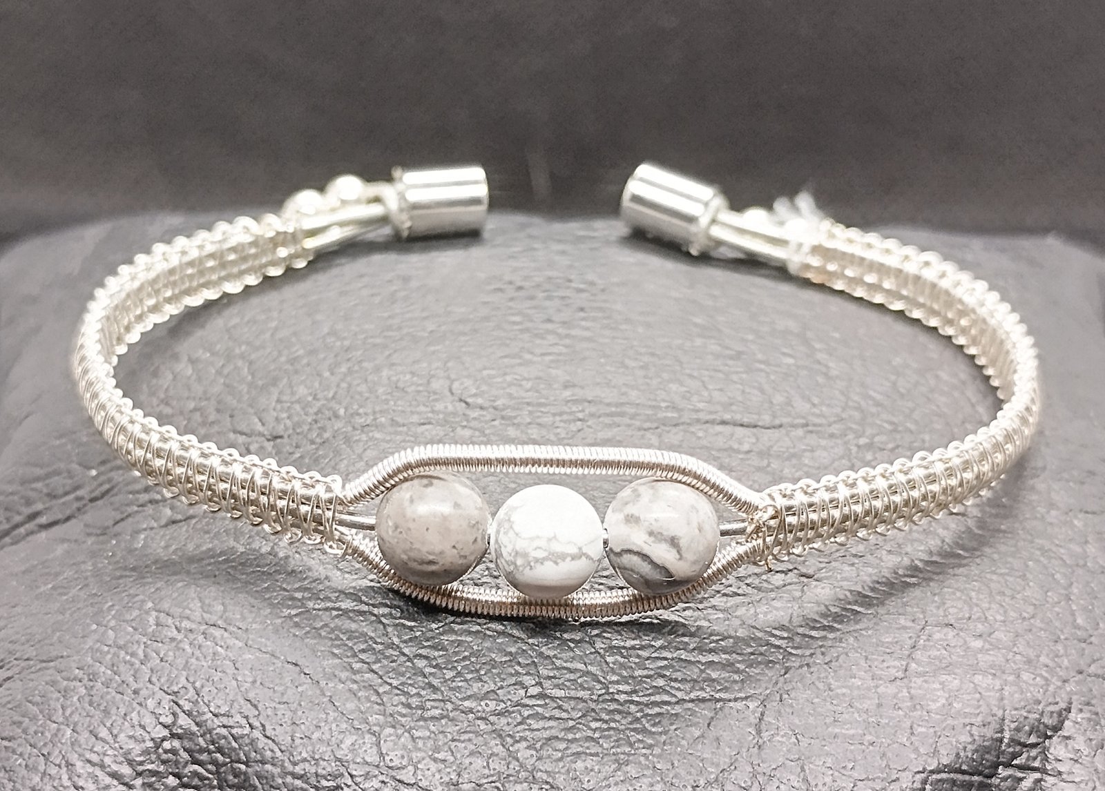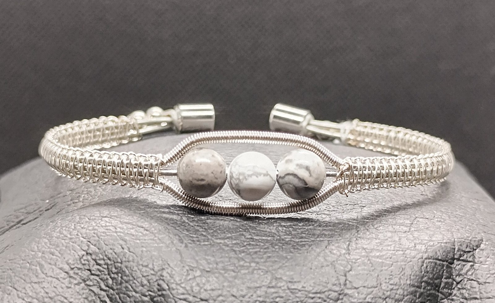 Pulsera macramé alambre hecho a mano con alambre de cobre bañado en plata con cuentas de jaspe line y howlita.