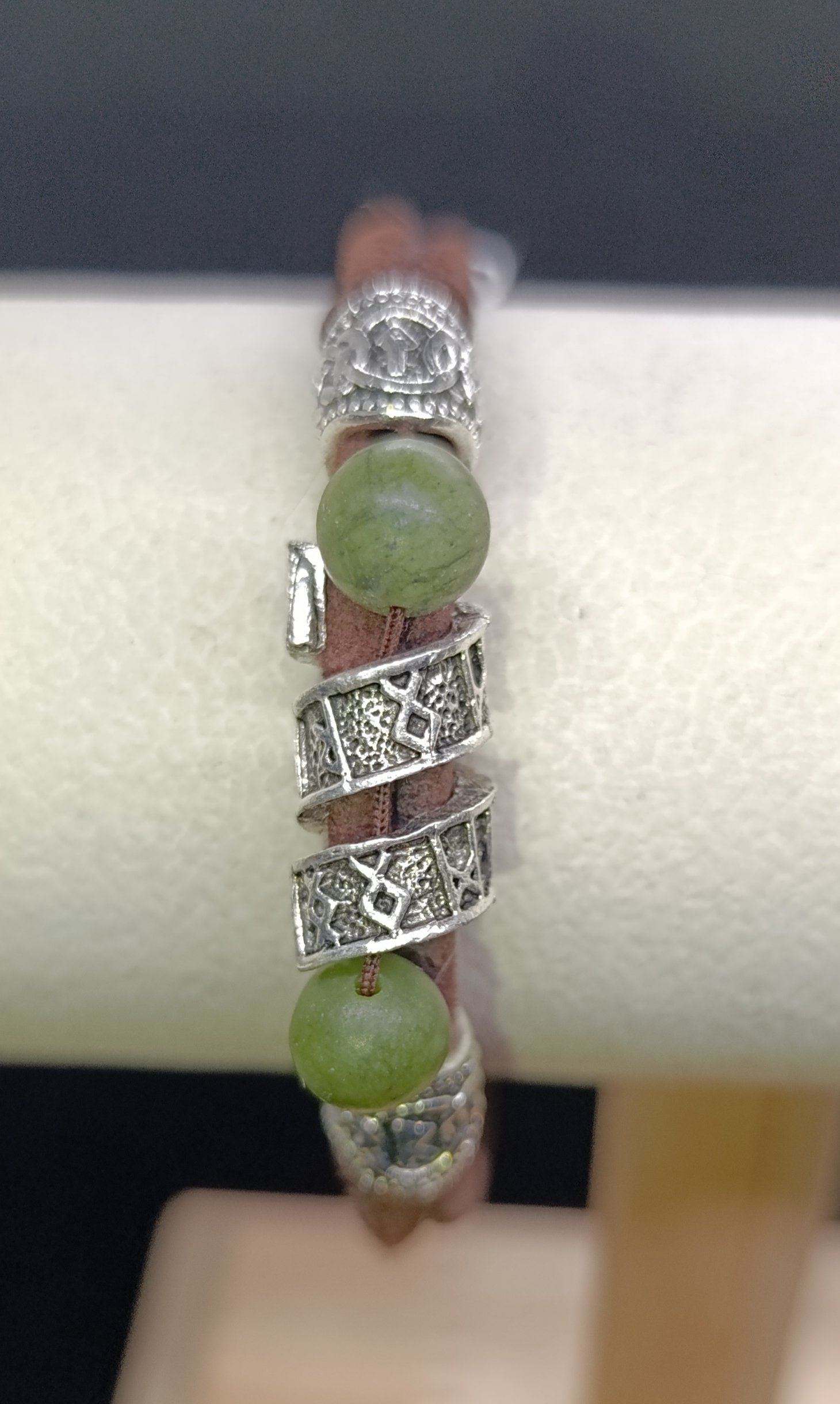 Pulsera Runas 2 hecha a mano con cuero de ubrique y cuentas de jadeita.