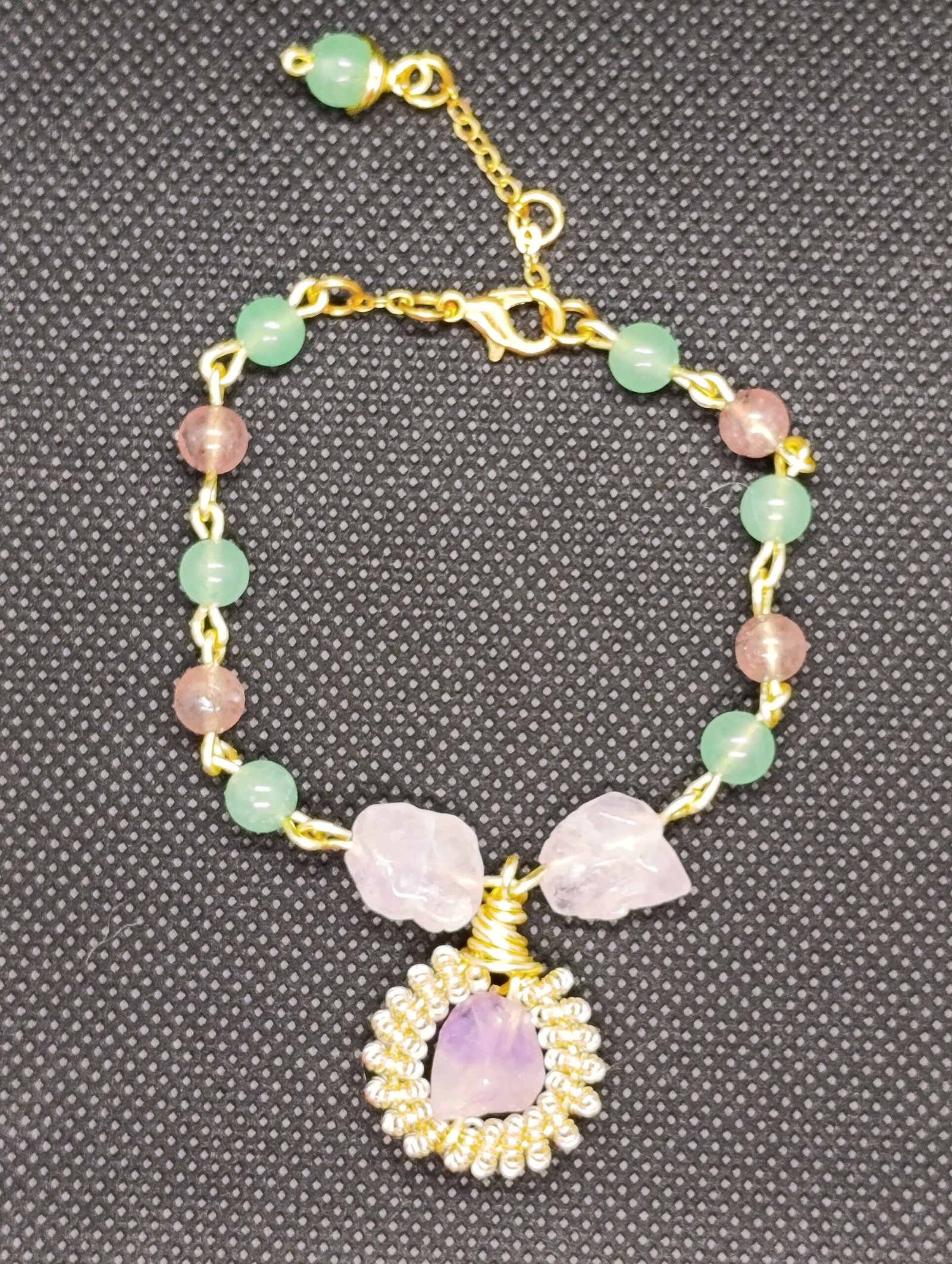Pulsera Sol Amatista hecha a mano con amatista en bruto y cuentas de cuarzo fresa